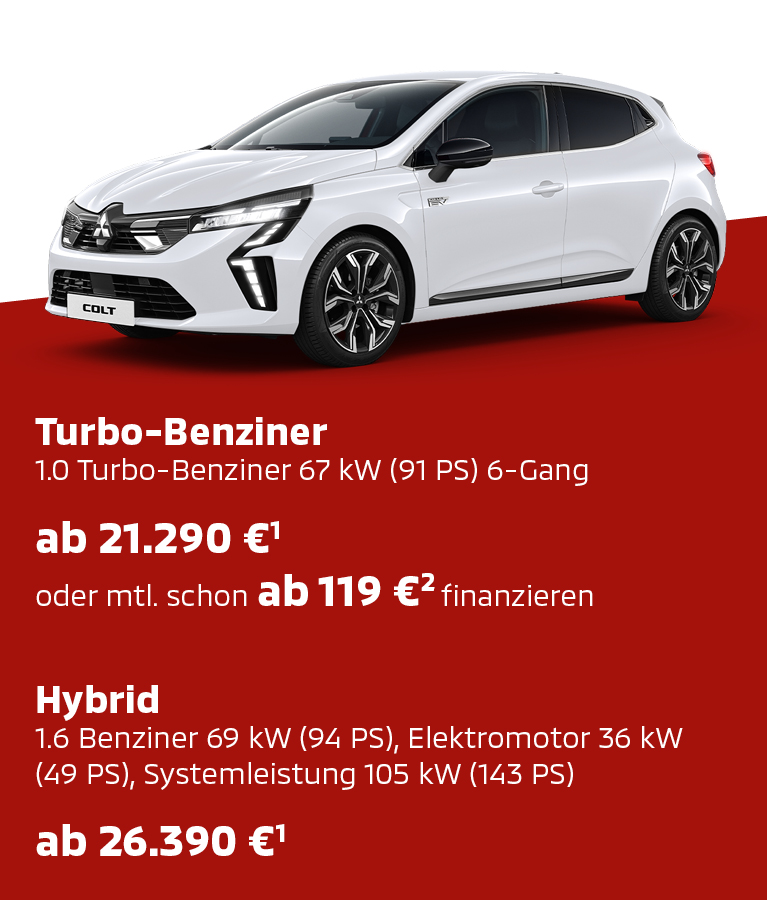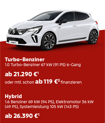 2 | COLT Edition 1.0 Turbo 67 kW (91 PS) 6-Gang Finanzierungsbeispiel (beispielhaftes Angebot, Stand: August 2025, Zinsänderungen bleiben vorbehalten): zugrunde liegender Fahrzeugpreis entspricht dem unverbindlich empfohlenen Preis der MMD Automobile GmbH, Friedberg, in Höhe von 21.290 € (dieser ergibt sich aus der unverbindlichen Preisempfehlung 22.790 € abzüglich 1.500 € unverbindl. empfohl. Aktions-Rabatt), Anzahlung 4.990,00 €, Nettodarlehensbetrag 16.300,00 €, Laufzeit 24 Monate, Sollzins (gebunden) 3,92 %, effektiver Jahreszins 3,99 %, 1. Monatsrate 118,83 €, 22 Monatsraten à 119,00 €, letzte Rate 14.780,00 €, Gesamtbetrag 22.506,83 €. Ein freibleibendes Angebot der MKG Bank, Zweigniederlassung der MCE Bank GmbH, Schieferstein 9, 65439 Flörsheim, zzgl. Überführungskosten. Repräsentative Kreditbeispiele: Die Angaben stellen zugleich das 2/3-Beispiel gem. § 6 a Abs. 4 PAngV dar.