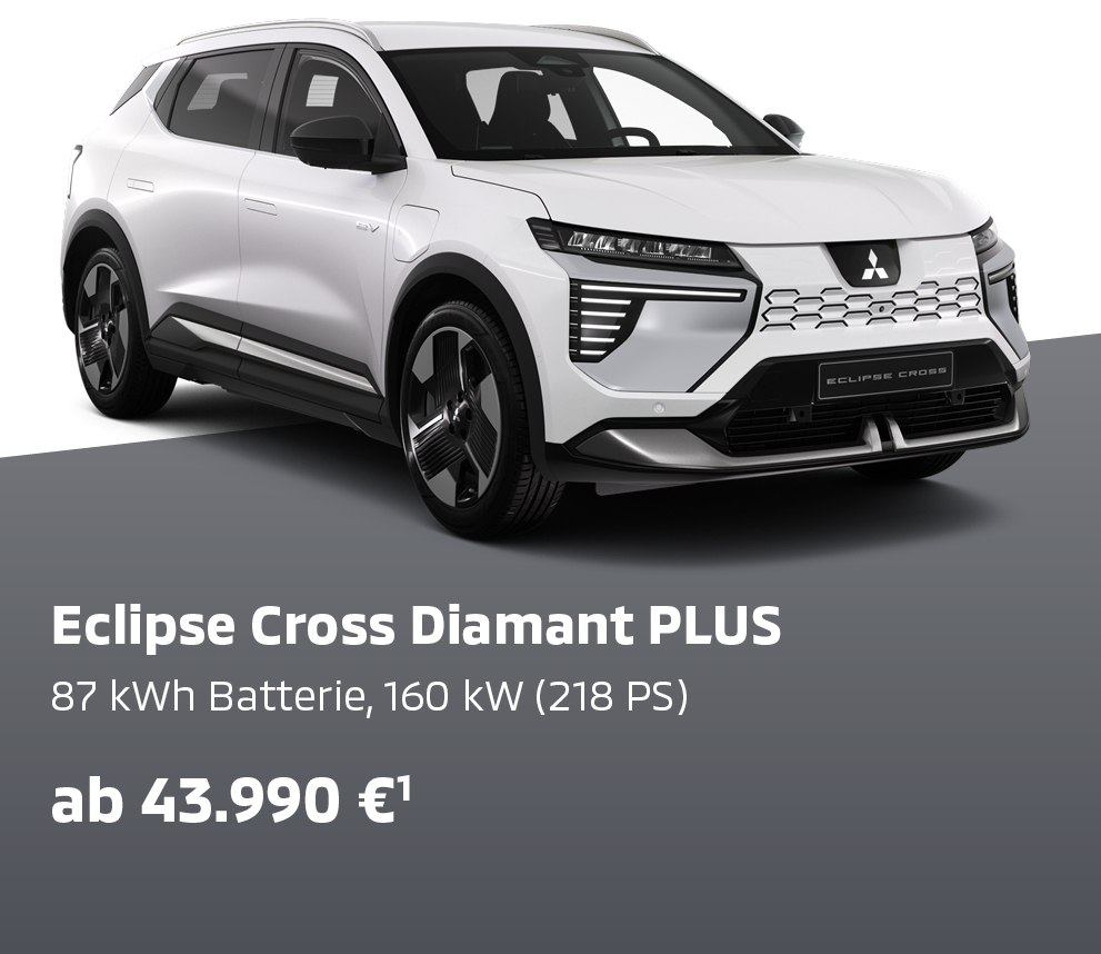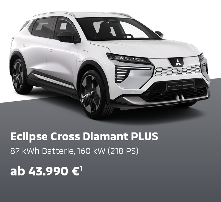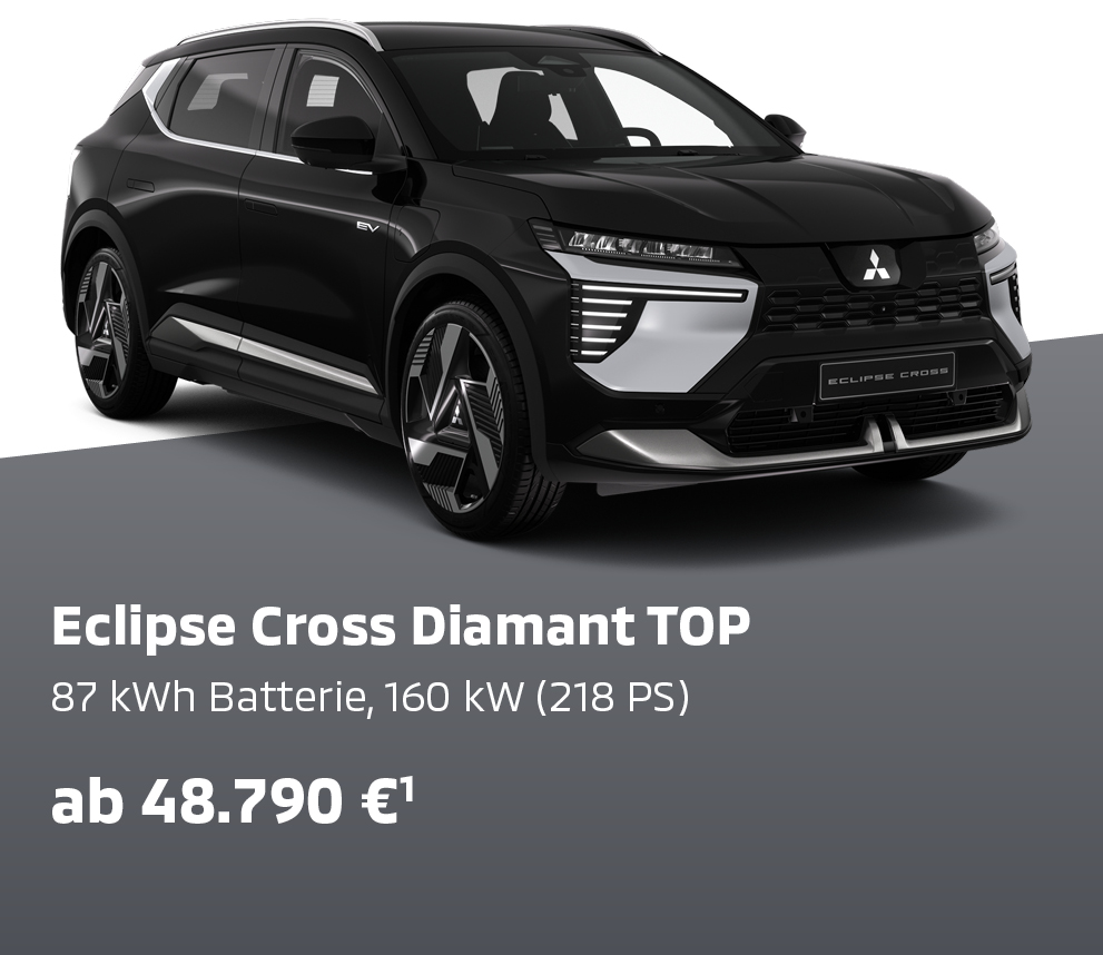 Eclipse Cross Diamant TOP, 160 kW (218 PS) Energieverbrauch 16,9 kWh/100 km Strom; CO2-Emission 0 g/km; CO2-Klasse A; Eclipse Cross Diamant TOP mit Luxury-Paket, 160 kW (218 PS) Energieverbrauch 17,1 kWh/100 km Strom; CO2-Emission 0 g/km; CO2-Klasse A; kombinierte Werte.**