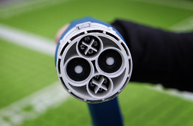 Europäischer Standard zum Laden mit Wechselstrom (AC): ein Dreiphasen-Stecker mit einer Ladeleistung bis zu 43 kW (440 V, 63 A). Die meisten Fahrzeuge sind technisch jedoch auf eine maximale AC-Leistung von 11 kW beschränkt.