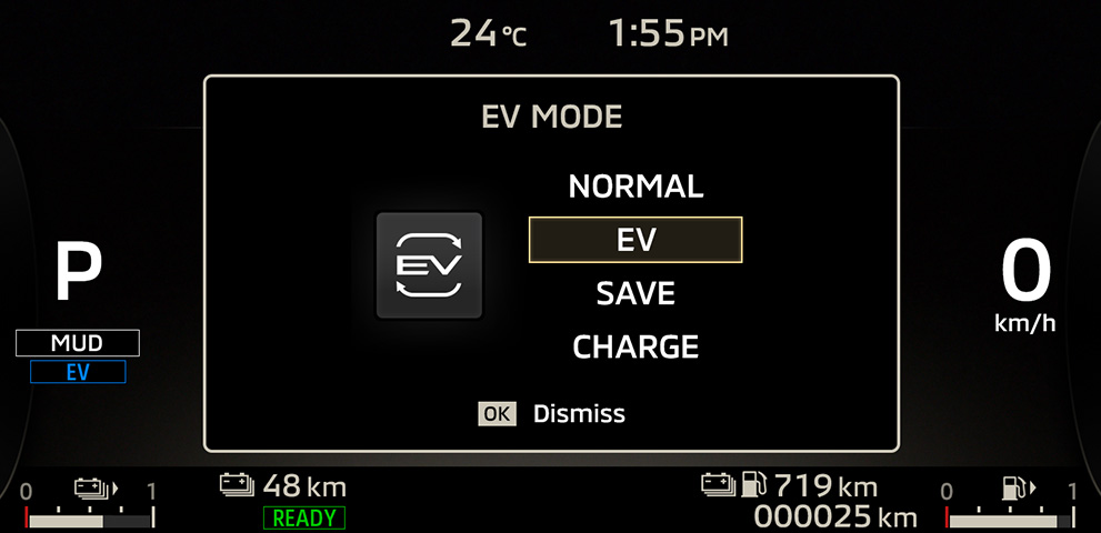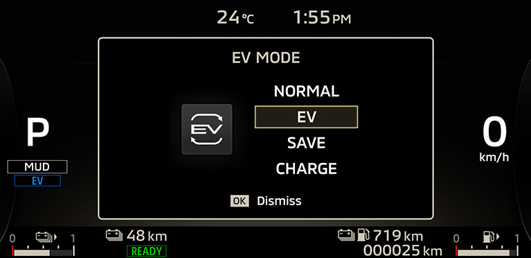 Folgende Modi können über die „EV-Taste“ in der Mittelkonsole ausgewählt werden. NORMAL: Optimiert automatisch den EV-/Hybrid-Antrieb, EV-Modus: reiner Elektrobetrieb, SAVE-Modus: Erhaltung des aktuellen Ladezustands für späteren Gebrauch, CHARGE-Modus: Aufladen der Batterie durch den Verbrennungsmotor.